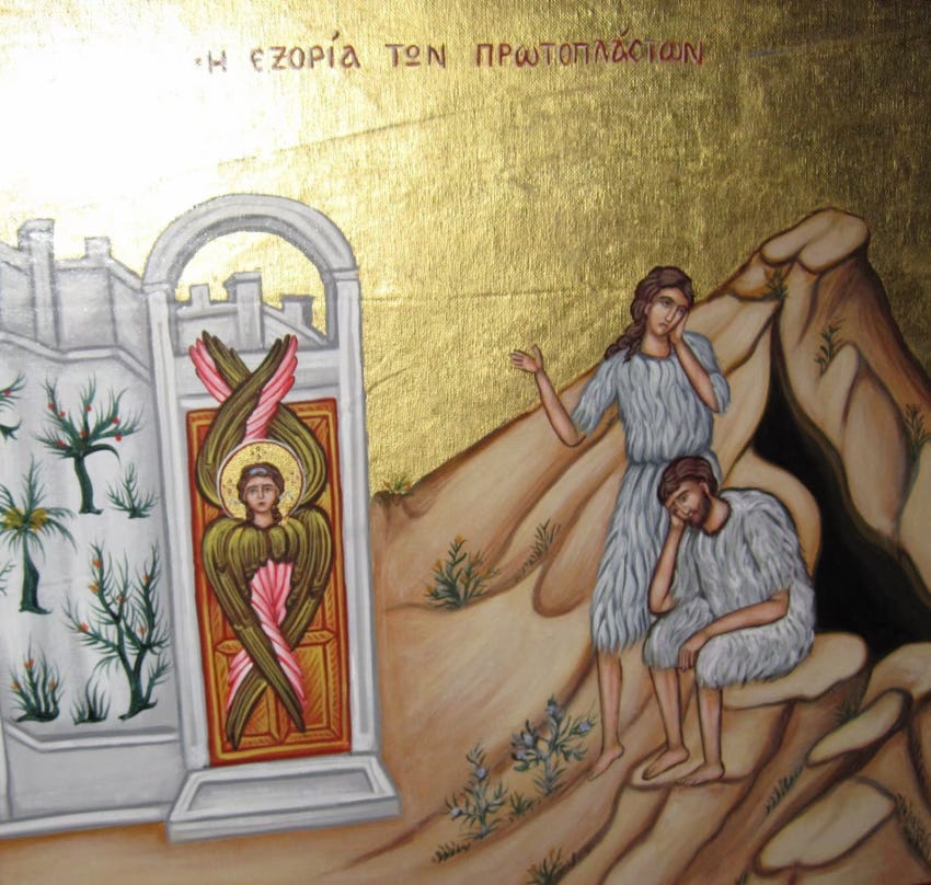“And he cast out Adam and caused him to dwell over against the garden of Delight, and stationed the cherubs and the fiery sword that turns about to keep the way of the tree of life.” The Lord placed Adam “over against” (i.e., nearby and directly across from) the gate to Paradise, so that the sight of Paradise, the rustling of its leaves, and its ineffable life-giving fragrance, ever near to him yet ever closed to him by the fiery cherubic sword, would provoke him to weep fiery tears constantly in profound grief over the perfect happiness he threw away for one moment of “freedom” from God. Adam and Eve lived the rest of their long lives in constant repentance, and we rank them with the saints of the Church.